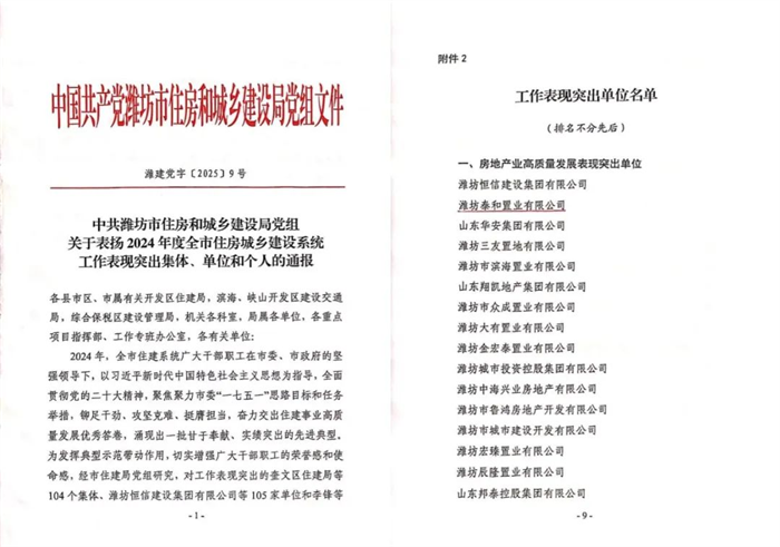 濰坊市住房和城鄉(xiāng)建設(shè)局:授予泰和置業(yè)“2024年度全市住建系統(tǒng)工作表現(xiàn)突出單位”