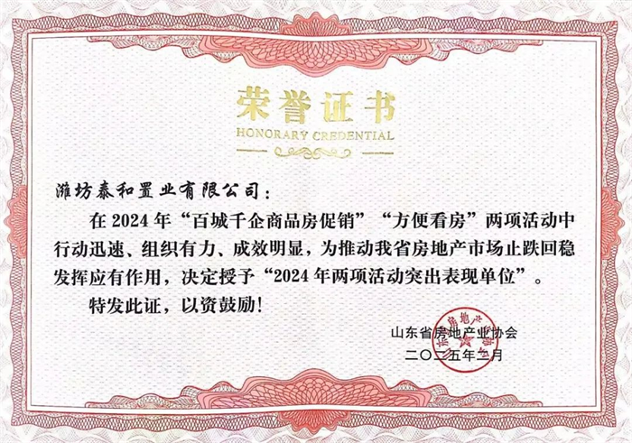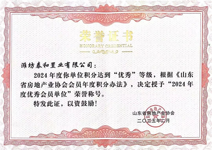 山東省房地產(chǎn)業(yè)協(xié)會:授予泰和置業(yè)“2024年度優(yōu)秀會員單位”“兩項活動突出表現(xiàn)單位”
