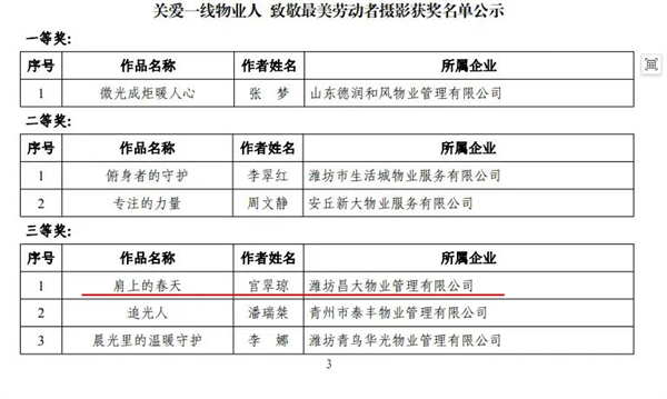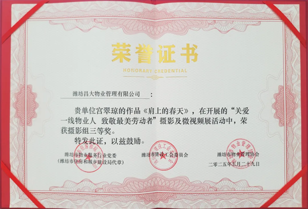 2025年5月30日,在全市物業(yè)行業(yè)“關愛一線物業(yè)人 致敬最美勞動者”攝影及微視頻展活動中,濰坊昌大物業(yè)管理有限公司提報的兩部作品雙雙獲獎!《肩上的春天》榮獲三等獎,《平凡微光·匠心守護》榮獲優(yōu)秀獎,這份雙重榮譽,是對昌大物業(yè)企業(yè)文化的生動詮釋,更是對全體物業(yè)人敬業(yè)精神的崇高禮贊!