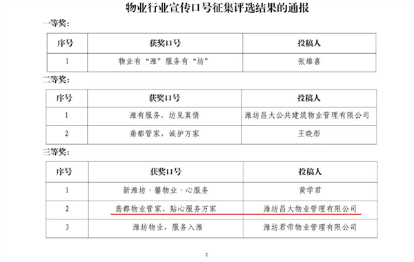 2025年7月11日,全市物業(yè)行業(yè)宣傳口號征集評選結果正式揭曉,昌大物業(yè)憑借“鳶都物業(yè)管家,貼心服務萬家”的響亮口號,從全國各地800余條投稿中脫穎而出,榮獲三等獎!這一口號充分展現了昌大物業(yè)扎根濰坊、服務萬家的責任擔當,同時展現了昌大物業(yè)“讓生活更美好”的堅定服務承諾。