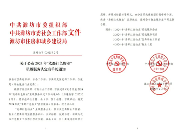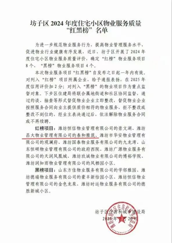 2025年2月20日,坊子區(qū)住房和城鄉(xiāng)建設局發(fā)布關于2024年度住宅小區(qū)物業(yè)服務質量“紅黑榜”名單,其中泰和雅筑被列入“紅榜”項目名單受到通報表揚。