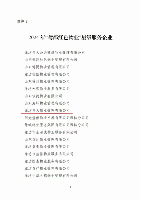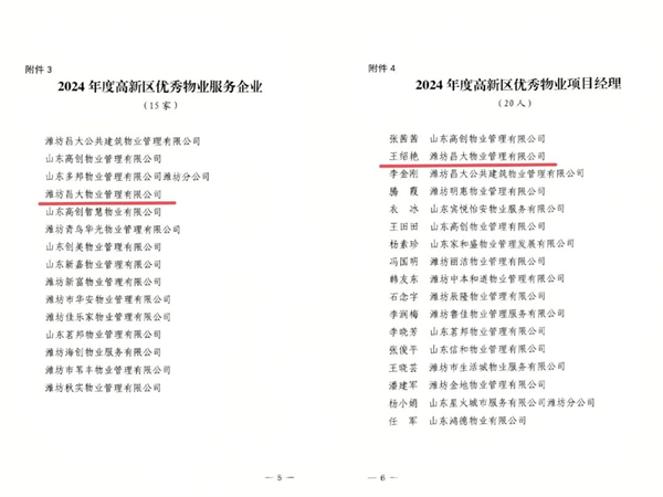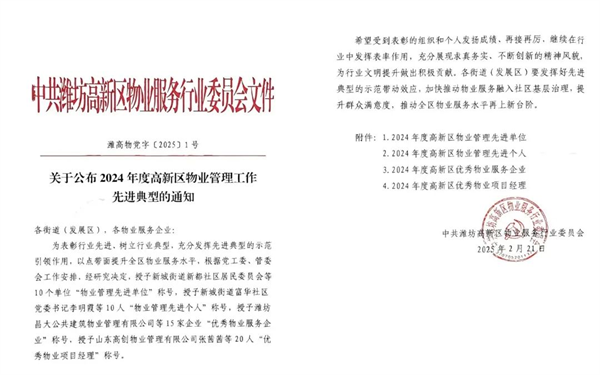 為表彰行業(yè)先進、樹立行業(yè)典型,充分發(fā)揮先進典型的示范引領作用,以點帶面提升全區(qū)物業(yè)服務水平,中共濰坊高新區(qū)物業(yè)服務行業(yè)委員會于2025年2月21日授予相關單位及個人榮譽。其中,昌大物業(yè)榮獲“2024年度高新區(qū)優(yōu)秀物業(yè)服務企業(yè)”,項目經理王紹艷獲評為“2024年度高新區(qū)優(yōu)秀物業(yè)項目經理”。