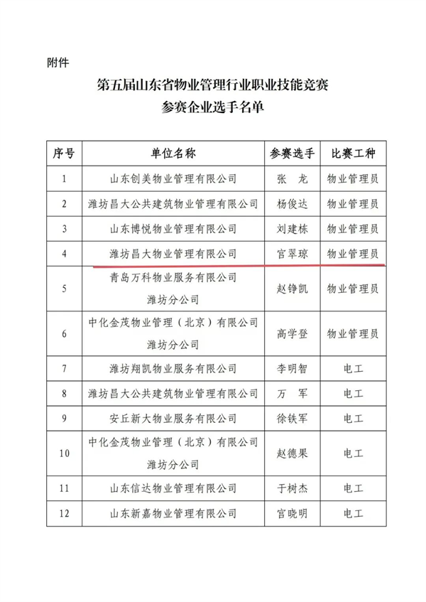2025年1月2日,濰坊市物業(yè)管理協(xié)發(fā)布關于表揚第五屆山東省物業(yè)管理行業(yè)職業(yè)技能競賽參賽企業(yè)選手的通報,其中昌大物業(yè)管理員宮翠瓊在競賽中成績優(yōu)異獲得表揚通報。
