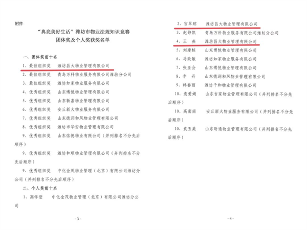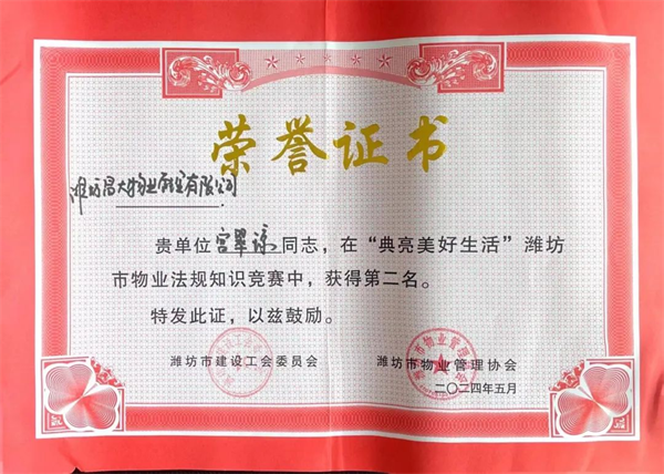 2024年5月,濰坊市建設工會委員會、濰坊市物業(yè)管理協(xié)會聯(lián)合舉辦了“典亮美好生活”物業(yè)法規(guī)知識競賽活動,旨在深入推進我市物業(yè)服務行業(yè)普法宣傳,提高物業(yè)從業(yè)人員法律意識,典亮美好生活。獲獎名單包括團體獎、個人獎各10名,其中昌大物業(yè)榮獲最佳組織獎,物業(yè)管理員宮翠瓊、王燕分別榮獲個人獎。