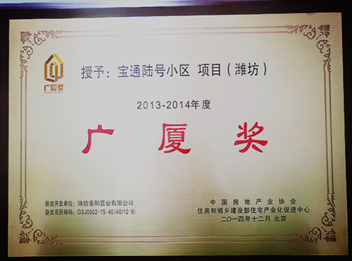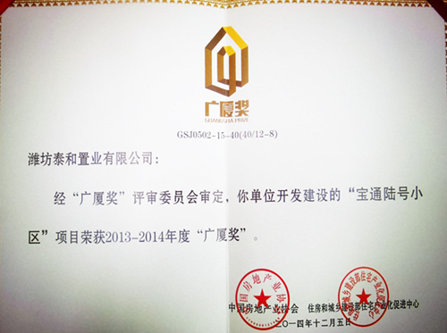 ? ? ? ?2014年12月5日,國(guó)務(wù)院批準(zhǔn)設(shè)立的國(guó)家級(jí)房地產(chǎn)業(yè)綜合性大獎(jiǎng)——國(guó)家“廣廈獎(jiǎng)”頒獎(jiǎng)典禮在北京隆重舉行。濰坊泰和置業(yè)有限公司開發(fā)的“寶通陸號(hào)”小區(qū),在眾多參評(píng)項(xiàng)目中脫穎而出,榮膺此項(xiàng)殊榮。這是房地產(chǎn)行業(yè)內(nèi)最權(quán)威和房地產(chǎn)項(xiàng)目的最高榮譽(yù)。集團(tuán)此項(xiàng)榮譽(yù)的獲得也填補(bǔ)了濰坊中心城區(qū)在獎(jiǎng)項(xiàng)上的歷史空白,實(shí)現(xiàn)了零的突破。
