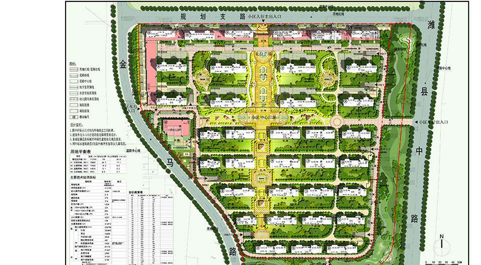 小區(qū)內(nèi)設(shè)置了貫穿南北和東西的兩條景觀軸,將整個小區(qū)劃分為高層和多層兩個大的組團。高層組團和多層組團之間設(shè)有小區(qū) 廣場。規(guī)劃北側(cè)設(shè)計一個人行主入口,沿金馬路和濰縣中路設(shè)計了兩個車行出入口,道路系統(tǒng)采用人車分流系統(tǒng)設(shè)計,機動車流向由外圍地下車庫出入口進入地下車庫, 不進入組團內(nèi)部,方便小區(qū)停車的同時也實現(xiàn)了小區(qū)內(nèi)的人車分流,小區(qū)車行道 設(shè)置了地面停車位,解決平時訪客的停車問題。進入小區(qū)后,通過沿中間綠化帶設(shè)置的人行景觀步道入戶。